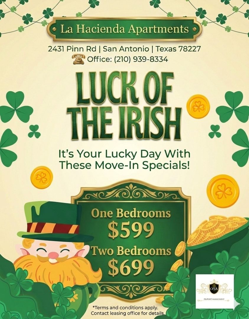 Why rely on a four-leaf clover when you can guarantee a win? This month, we’re bringing the Luck of the Irish straight to your front door with move-in specials that feel like finding a pot of gold!